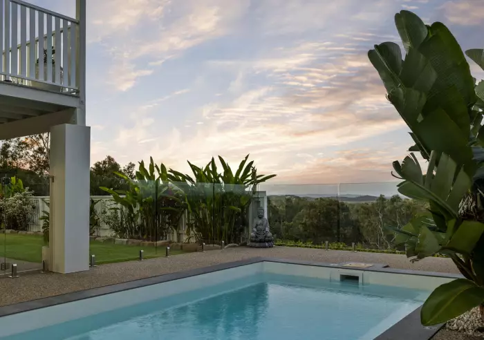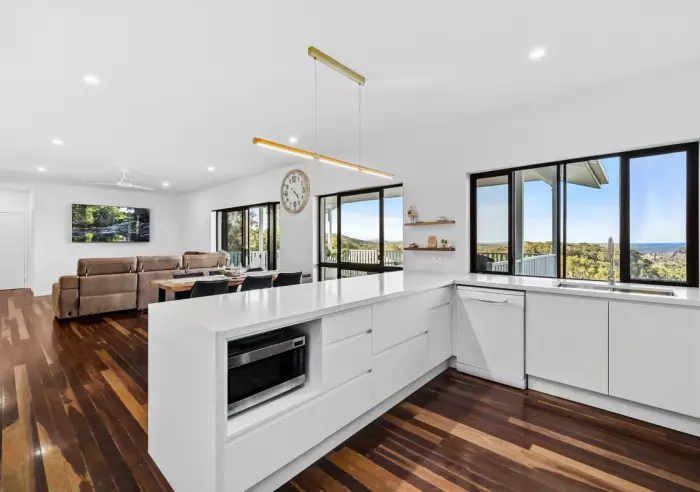 Upstairs, the home features three bedrooms and two bathrooms, including a spacious master suite with a walk-in robe and modern ensuite. The open-plan kitchen showcases stone benchtops and a walk-in butler's pantry, flowing seamlessly into the dining and living area that opens onto a large balcony - the perfect spot to unwind and soak in the incredible ocean and valley views.