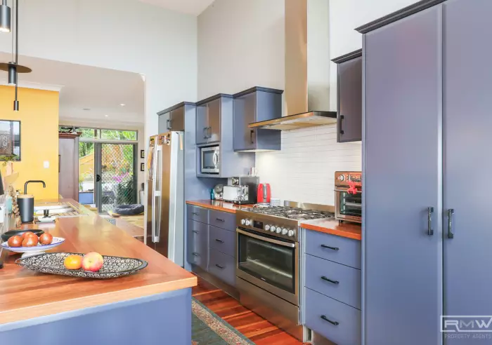 The heart of the home is the kitchen, featuring high ceilings that flood the space with natural light and enhance the open, airy feel. Air-conditioning and ceiling fans throughout ensure year-round comfort. The recently completed new main bathroom upstairs showcases modern finishes, adding a fresh, contemporary touch to the home's warm coastal style.
