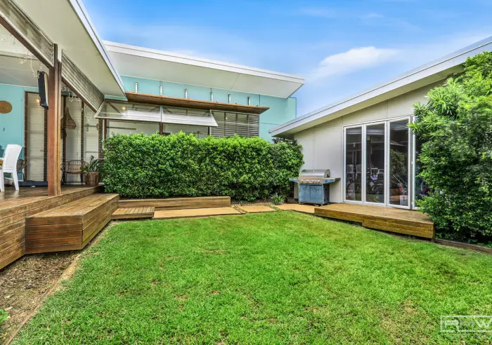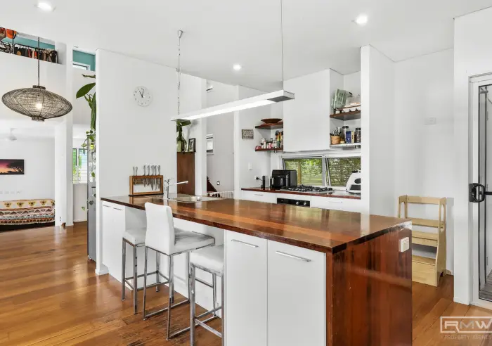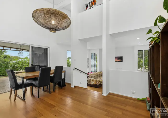 Additional highlights include a family bathroom, outdoor laundry, and a flexible workshop or studio space behind the double carport. Designed for comfort and efficiency, the home features solar hot water, a 5,000-gallon rainwater tank, spotted gum flooring, hardwood decks, and quality finishes throughout. Freshly painted inside and out in 2022, with potential for a private plunge pool in the courtyard.