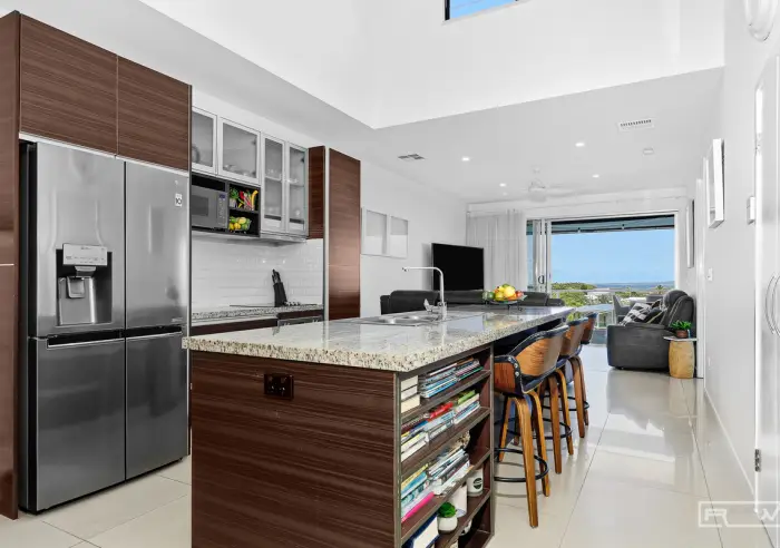 The open plan living, dining and kitchen area is light filled and flows effortlessly to the generous balcony, perfect for entertaining or simply enjoying the sea breeze and elevated outlook across Barlows Hill and the coastline beyond. The kitchen is finished with quality stone benchtops and ample storage, ideal for both everyday living and hosting guests.