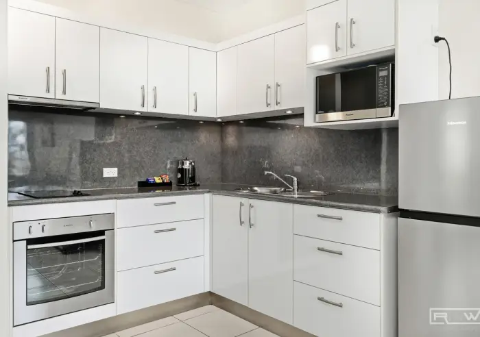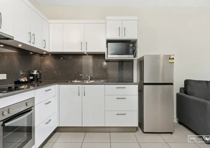 Inside, the apartment offers a functional open plan layout designed for low maintenance living and effortless holiday accommodation. The kitchen features generous cabinetry and practical bench space, flowing through to the tiled living area filled with natural light.
