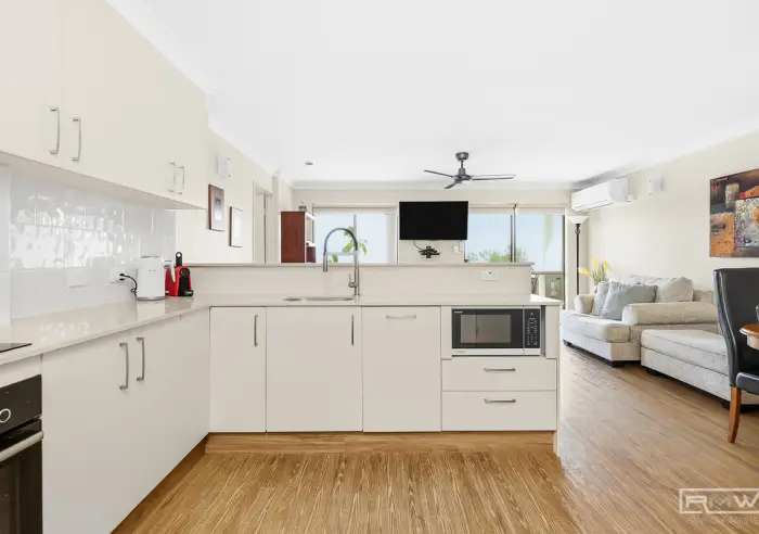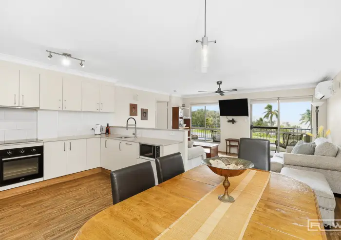 All three bedrooms are generously sized, offering flexibility for family, guests or holiday accommodation. The main bedroom includes a built in robe, while the centrally located bathroom services the apartment with ease. Air conditioning throughout ensures year round comfort, whether it is a warm Queensland summer or a breezy winter afternoon.