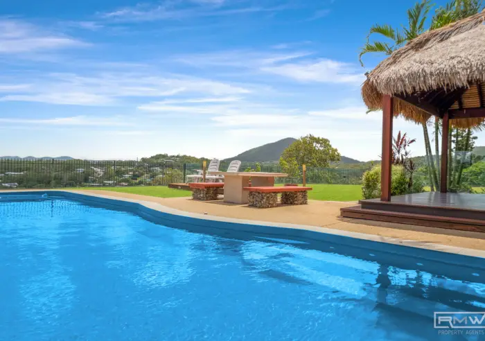 At the heart of the outdoor retreat sits a sparkling 11.7m pool with a cabana — your own private oasis with sweeping views across Yeppoon.